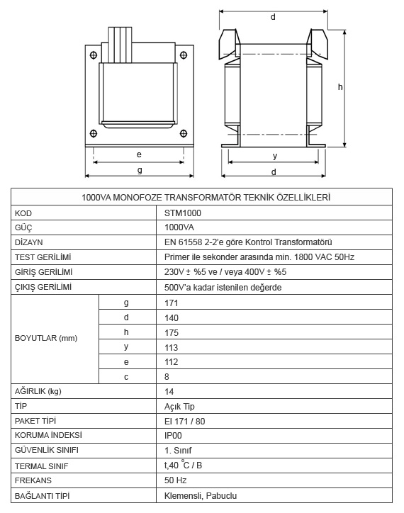 | STM1000 | 1000 | EI 171/80 | 171 | 140 | 175 | 113 | 112 | 8 | 14 |