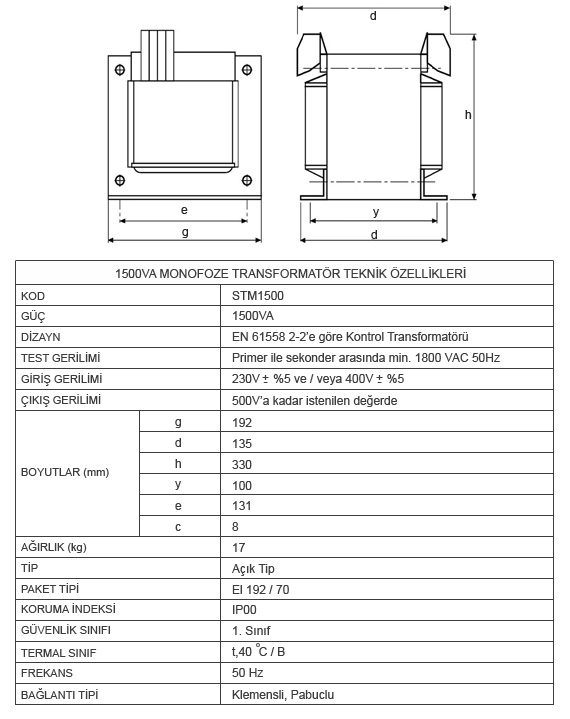 | STM1500 | 1500 | EI 192/70 | 192 | 135 | 190 | 100 | 131 | 8 | 17 |