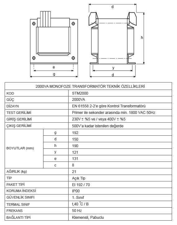 | STM2000 | 2000 | EI 192/90 | 192 | 160 | 190 | 125 | 131 | 8 | 21 |