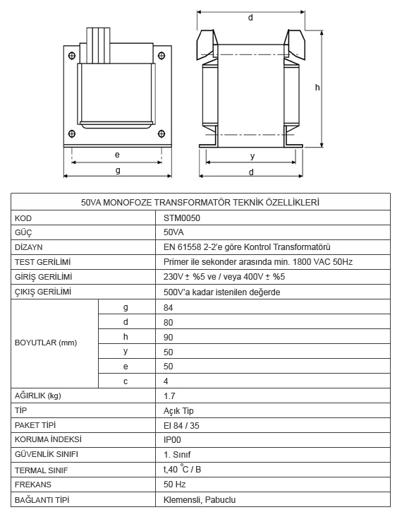 | STM0050 | 50 | EI 84/35 | 84 | 80 | 90 | 50 | 50 | 4 | 1,7 |